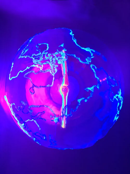 Black light fun-- These are neon models of flying-saucer-shaped objects which I made with metal armature, plaster, gesso, foamboard, clay, black light paint. Includes spaceship, blue/green jellyfish, records (Jimi Hendrix, Are you Experienced; David Bowie, Low), clock, donut, peace sign, blue spider, purple western astrological wheel, red eastern astrological wheel, red blood cell, blue circular saw, green wheel.17” wide, 23” high, 18” deep. Including lizards: 43” wide, 36” high, 18” deep.
