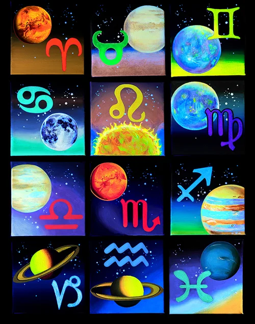 My design of the glyph for each astrological sign, with associated planets and colors.