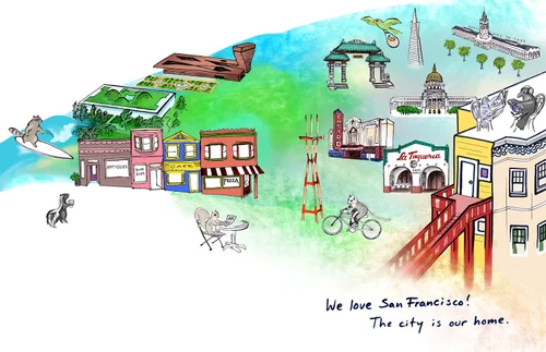 Hill, coast live oak, raven, San Francisco garter snake, and salt marsh harvest mouse: The comparatively small size of the landscape, to the animals, references the loss of habitat for many native and endangered species.